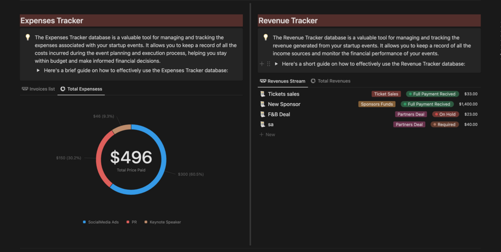 - Financial Tracking: Stay on top of your event budget with the Expenses Tracker and Revenue Tracker. Keep a record of your expenses and income to ensure financial transparency and profitability.