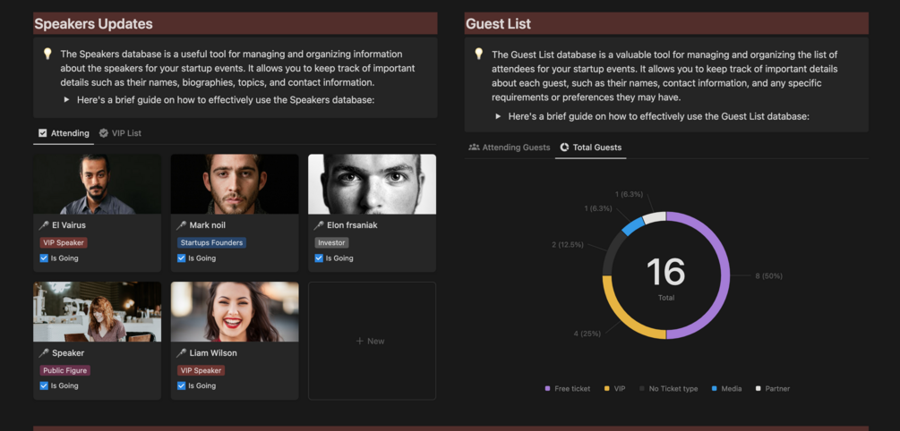 - Automated Analytics: Gain valuable insights into your event's performance with automated analytics. Track attendance, Speakers, and other key metrics to measure the success of your event. (Notion Charts Updated)