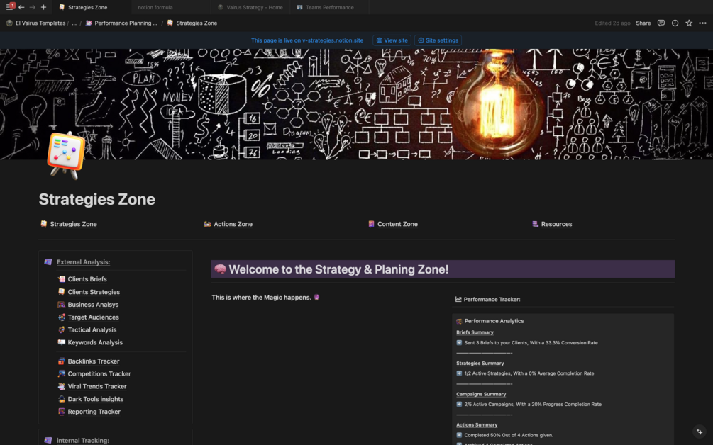 The Strategy Zone provides top management with the tools to develop, evaluate, and refine marketing strategies. It includes templates for conducting external and internal analyses, tracking performance, and managing brand assets. This zone empowers businesses to research markets, understand competitors, and align team performance with strategic goals. With tools for performance reviews, employee engagement, and team training, you’ll have everything needed to make informed, data-driven decisions.