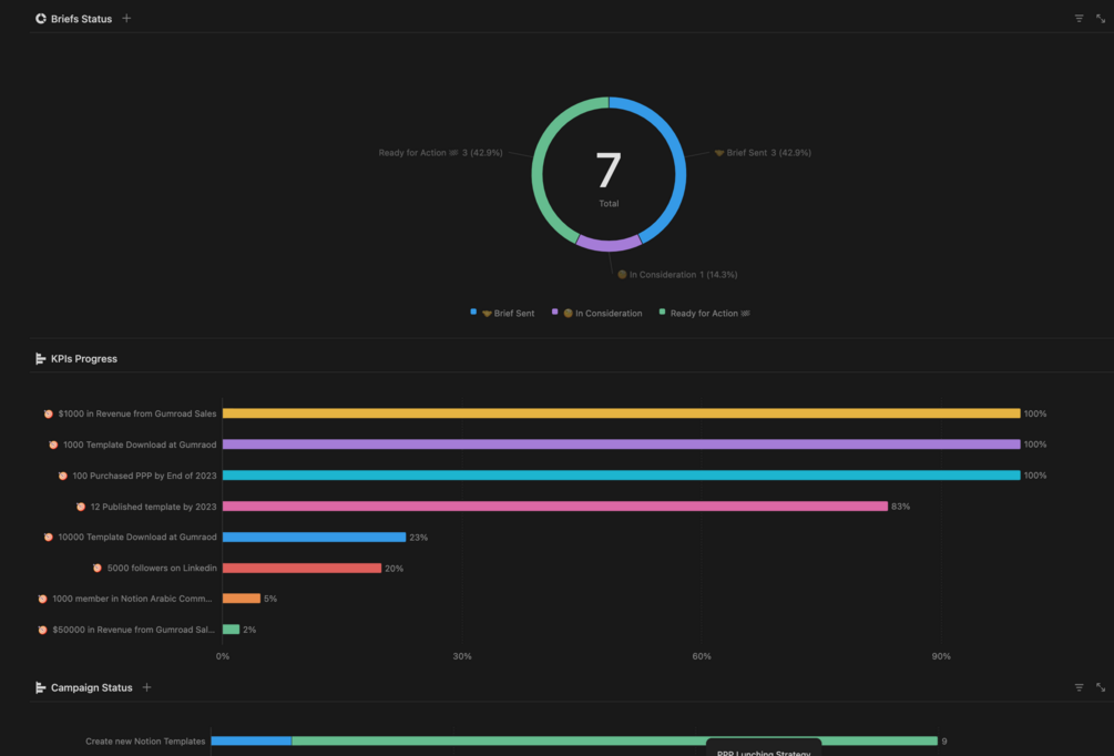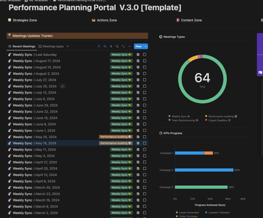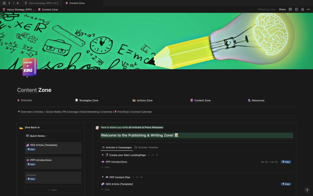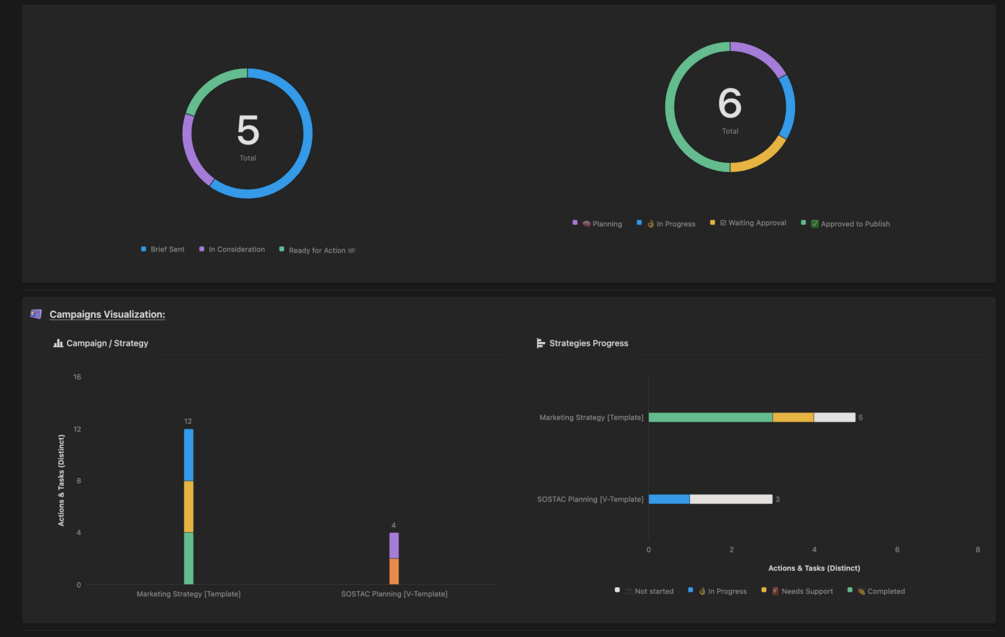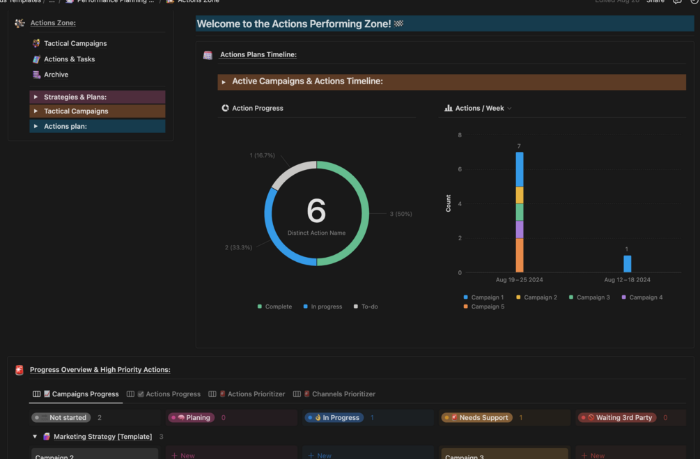 The Actions Zone is where strategies come to life. This section focuses on executing, tracking, and archiving campaigns, tactical plans, and high-priority tasks. It integrates seamlessly with the Strategy and Content Zones, ensuring that all high-level goals are translated into actionable tasks. With a clear timeline of active campaigns and a roadmap for execution, you’ll have the tools to monitor progress and ensure your team stays on target.